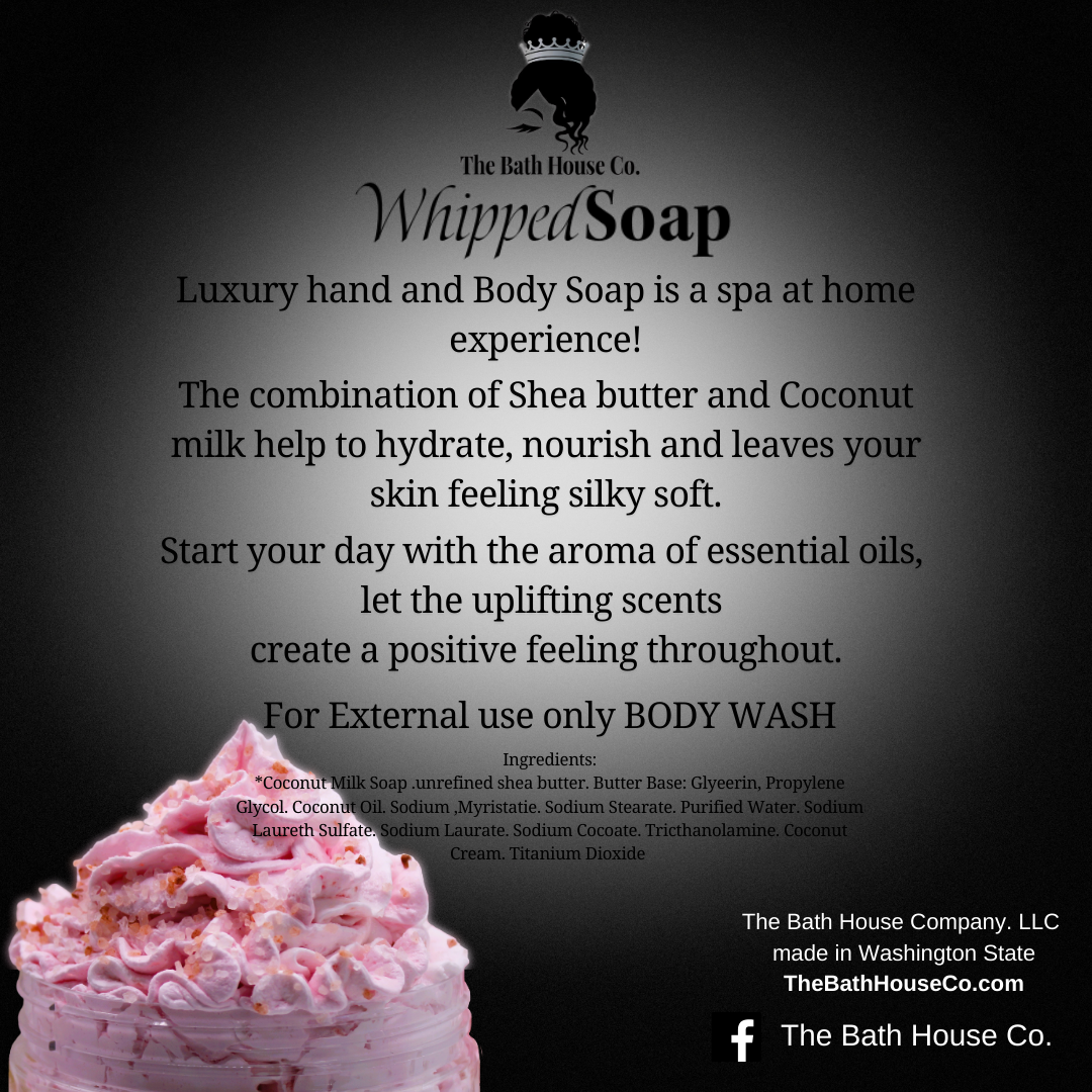 This is not your typical body wash. Whipped soap is a masterful combination of shea butter and coconut milk soap designed to nourish, hydrate and rejuvenate your skin. Natural essential oils will elevate your mood with each use, helping to create a positive vibe and set the tone for your day. Safe to use on your hands, body and even while shaving this whipped soap is truly a spa like experience at home.